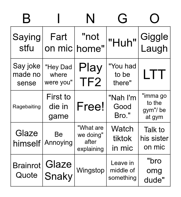 This bingo card has a free space and 24 words: Be Annoying, Glaze Snaky, Play TF2, Brainrot Quote, Giggle Laugh, Saying stfu, Say joke made no sense, Fart on mic, "Nah I'm Good Bro.", "What are we doing" after explaining, "You had to be there", Ragebaiting, Watch tiktok in mic, Talk to his sister on mic, "Hey Dad where were you", Leave in middle of something, "imma go to the gym"/ be at gym, "not home", LTT, First to die in game, "bro omg dude", Glaze himself, "Huh" and Wingstop.