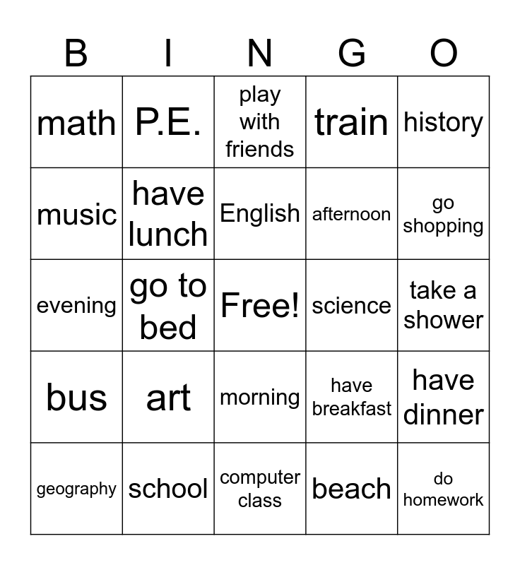 This bingo card has a free space and 25 words: art, computer class, English, geography, history, math, music, P.E., science, morning, afternoon, evening, have breakfast, have dinner, have lunch, play sports, take a shower, play with friends, go shopping, go to bed, do homework, school, bus, train and beach.