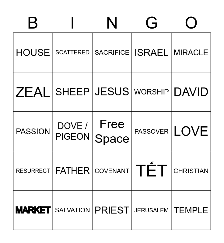 This bingo card has a free space and 24 words: FATHER, SALVATION, JESUS, MARKET, MIRACLE, HOUSE, ZEAL, SCATTERED, PASSOVER, COVENANT, WORSHIP, PASSION, TẾT, CHRISTIAN, SHEEP, JERUSALEM, LOVE, SACRIFICE, DAVID, DOVE / PIGEON, TEMPLE, RESURRECT, ISRAEL and PRIEST.