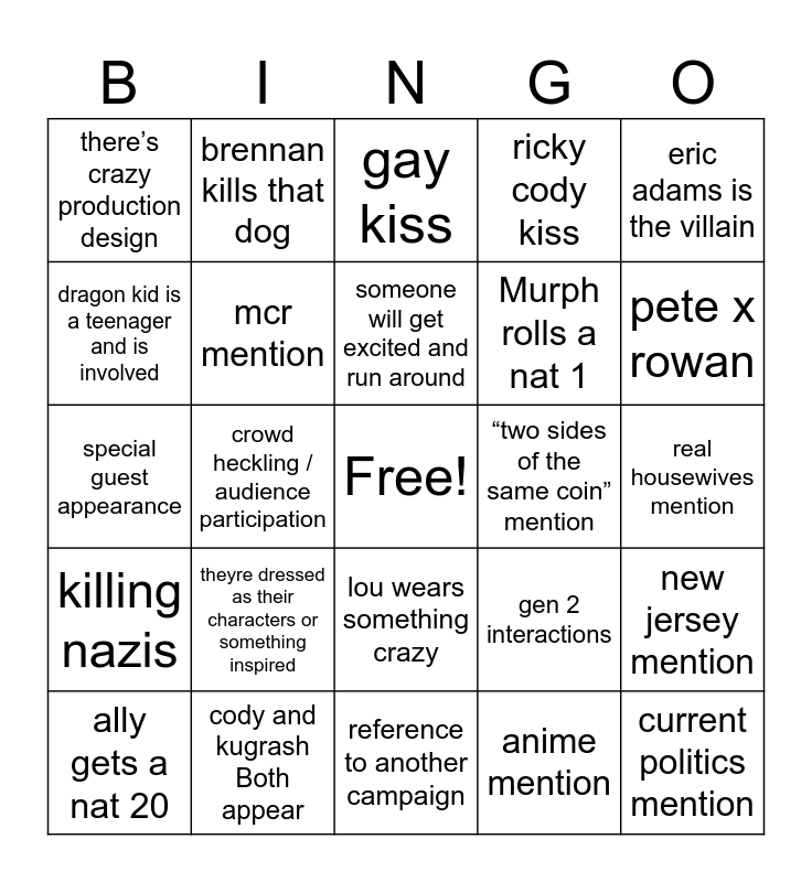This bingo card has a free space and 24 words: theyre dressed as their characters or something inspired, cody and kugrash Both appear, someone will get excited and run around, ally gets a nat 20, eric adams is the villain, there’s crazy production design, dragon kid is a teenager and is involved, brennan kills that dog, “two sides of the same coin” mention, lou wears something crazy, Murph rolls a nat 1, special guest appearance, gen 2 interactions, new jersey mention, mcr mention, anime mention, real housewives mention, gay kiss, pete x rowan, crowd heckling / audience participation, current politics mention, killing nazis, ricky cody kiss and reference to another campaign.