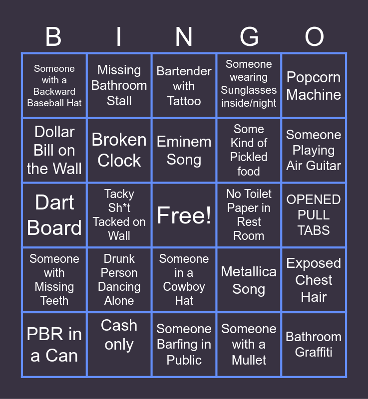This bingo card has a free space and 24 words: Drunk Person Dancing Alone, Cash only, Eminem Song, PBR in a Can, Popcorn Machine, Someone with a Backward Baseball Hat, Dollar Bill on the Wall, Missing Bathroom Stall, No Toilet Paper in Rest Room, Someone in a Cowboy Hat, Some Kind of Pickled food, Dart Board, Metallica Song, Exposed Chest Hair, Broken Clock, Someone with a Mullet, OPENED PULL TABS, Bartender with Tattoo, Someone Playing Air Guitar, Tacky Sh*t Tacked on Wall, Bathroom Graffiti, Someone with Missing Teeth, Someone wearing Sunglasses inside/night and Someone Barfing in Public.