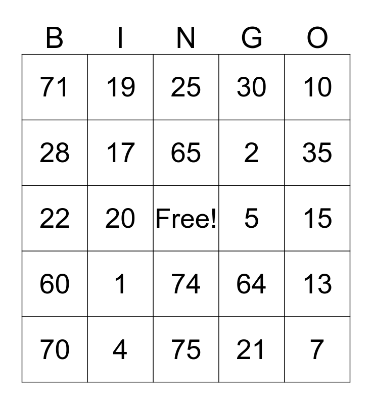 This bingo card has a free space and 24 words: 1, 4, 65, 70, 10, 71, 28, 19, 5, 74, 2, 22, 64, 13, 17, 21, 15, 25, 35, 20, 7, 60, 30 and 75.