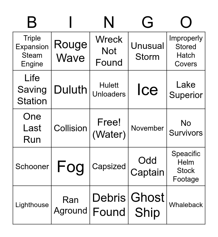 This bingo card has a free space and 24 words: Fog, Ran Aground, Hulett Unloaders, Lighthouse, Improperly Stored Hatch Covers, Triple Expansion Steam Engine, Life Saving Station, Rouge Wave, November, Capsized, Ice, One Last Run, Odd Captain, Speacific Helm Stock Footage, Duluth, Ghost Ship, No Survivors, Wreck Not Found, Lake Superior, Collision, Whaleback, Schooner, Unusual Storm and Debris Found.