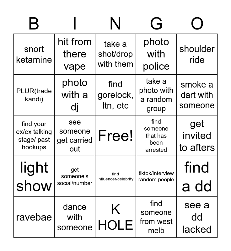This bingo card has a free space and 24 words: get someone’s social/number, dance with someone, find gorelock, ltn, etc, ravebae, shoulder ride, snort ketamine, PLUR(trade kandi), hit from there vape, find someone that has been arrested, find influencer/celebrity, take a photo with a random group, find your ex/ex talking stage/ past hookups, tiktok/interview random people, find a dd, photo with a dj, find someone from west melb, get invited to afters, take a shot/drop with them, smoke a dart with someone, see someone get carried out, see a dd lacked, light show, photo with police and K HOLE.