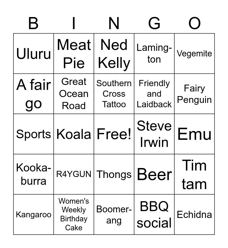 This bingo card has a free space and 29 words: Kangaroo, Great Barrier Reef, Koala, Sydney Opera House, Uluru, Ned Kelly, Great Ocean Road, R4YGUN, Steve Irwin, Women's Weekly Birthday Cake, Emu, Echidna, Boomer-ang, BBQ social, Fairy Penguin, Beach Cricket, Thongs, Kooka-burra, Vegemite, Sports, Beer, Sarcasm, Friendly and Laidback, A fair go, Laming-ton, Meat Pie, Tim tam, Southern Cross Tattoo and Golden Wattle.