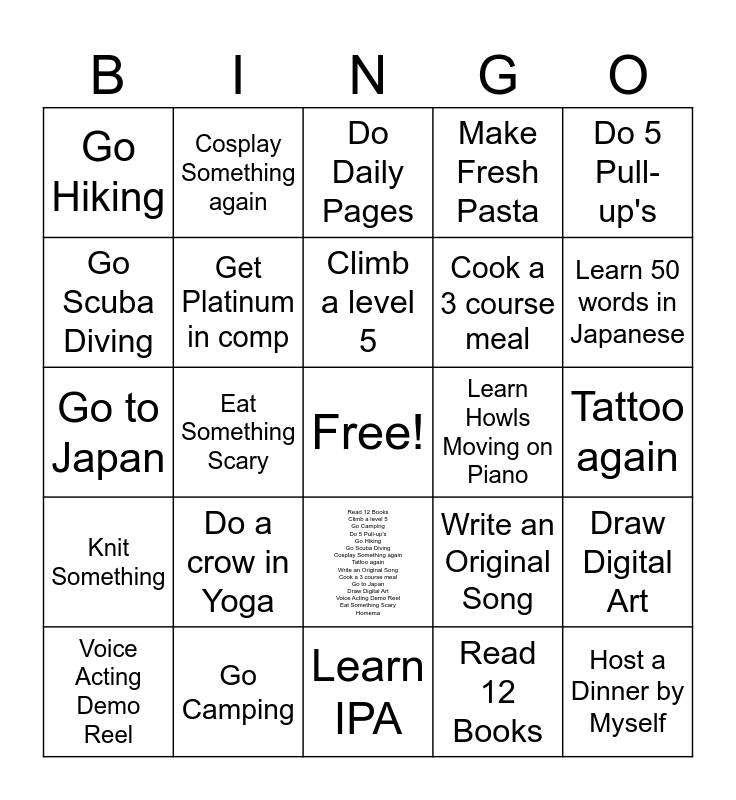 This bingo card has a free space and 26 words: Read 12 Books Climb a level 5 Go Camping Do 5 Pull-up's Go Hiking Go Scuba Diving Cosplay Something again Tattoo again Write an Original Song Cook a 3 course meal Go to Japan Draw Digital Art Voice Acting Demo Reel Eat Something Scary Homema, Read 12 Books, Climb a level 5, Go Camping, Do 5 Pull-up's, Go Hiking, Go Scuba Diving, Cosplay Something again, Tattoo again, Write an Original Song, Cook a 3 course meal, Go to Japan, Draw Digital Art, Voice Acting Demo Reel, Eat Something Scary, Homemade Ice Cream, Make Fresh Pasta, Knit Something, Do Daily Pages, Host a Dinner by Myself, Learn 50 words in Japanese, Learn IPA, Learn Howls Moving on Piano, Do a crow in Yoga, Get Platinum in comp and Repaint Spongebob Bathroom.