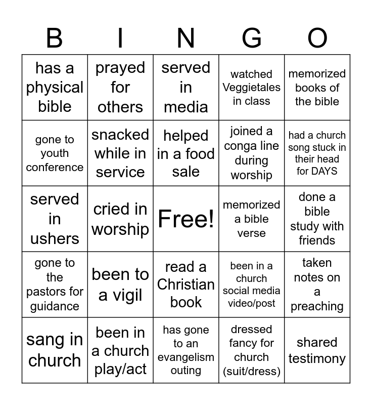This bingo card has a free space and 24 words: sang in church, been to a vigil, helped in a food sale, dressed fancy for church (suit/dress), memorized books of the bible, has a physical bible, prayed for others, served in media, memorized a bible verse, done a bible study with friends, served in ushers, snacked while in service, been in a church social media video/post, taken notes on a preaching, gone to youth conference, been in a church play/act, has gone to an evangelism outing, watched Veggietales in class, had a church song stuck in their head for DAYS, gone to the pastors for guidance, cried in worship, read a Christian book, joined a conga line during worship and shared testimony.