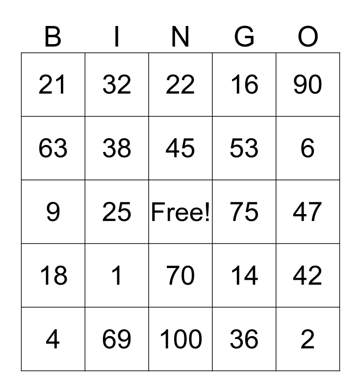 This bingo card has a free space and 24 words: 1, 69, 45, 4, 90, 21, 63, 32, 75, 70, 53, 9, 14, 42, 38, 36, 47, 22, 6, 25, 2, 18, 16 and 100.