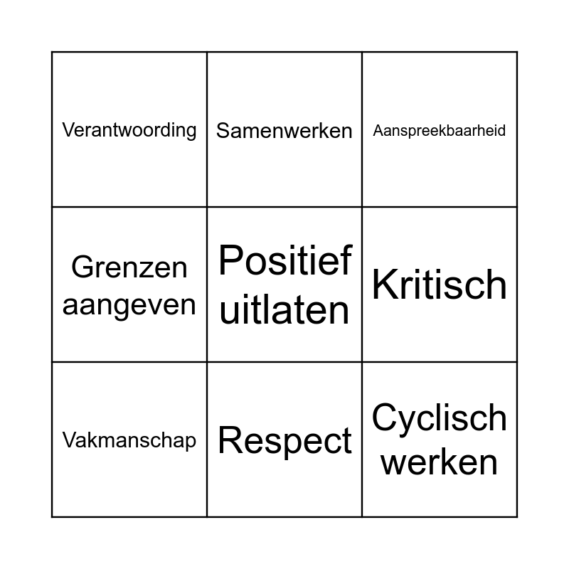 This bingo card has 1 images and 16 words: Wet en regelgeving, Geheimhouding, Aanspreekbaarheid, Verantwoording, Grenzen aangeven, Deskundigheid bevordering, Vakmanschap, Respect, Kritisch, Zelfreflectie, Transparant, Positief uitlaten, Samenwerken, Cyclisch werken, Werkrelatie and Signalen delen.