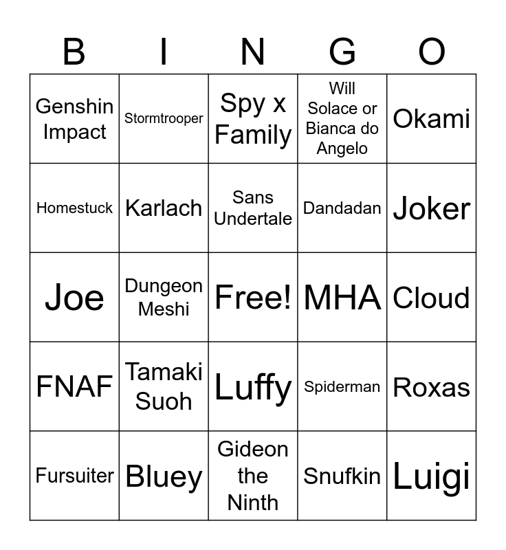 This bingo card has a free space and 24 words: Tamaki Suoh, Bluey, Sans Undertale, Fursuiter, Okami, Genshin Impact, Homestuck, Stormtrooper, MHA, Luffy, Dandadan, Joe, Spiderman, Roxas, Karlach, Snufkin, Cloud, Spy x Family, Joker, Dungeon Meshi, Luigi, FNAF, Will Solace or Bianca do Angelo and Gideon the Ninth.