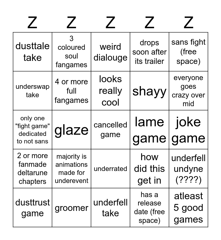 This bingo card has 25 words: majority is animations made for underevent, underfell take, looks really cool, dusttrust game, sans fight (free space), dusttale take, underswap take, 3 coloured soul fangames, lame game, underrated, shayy, only one "fight game" dedicated to not sans, how did this get in, underfell undyne (????), 4 or more full fangames, atleast 5 good games, joke game, weird dialouge, everyone goes crazy over mid, glaze, cancelled game, groomer, 2 or more fanmade deltarune chapters, drops soon after its trailer and has a release date (free space).