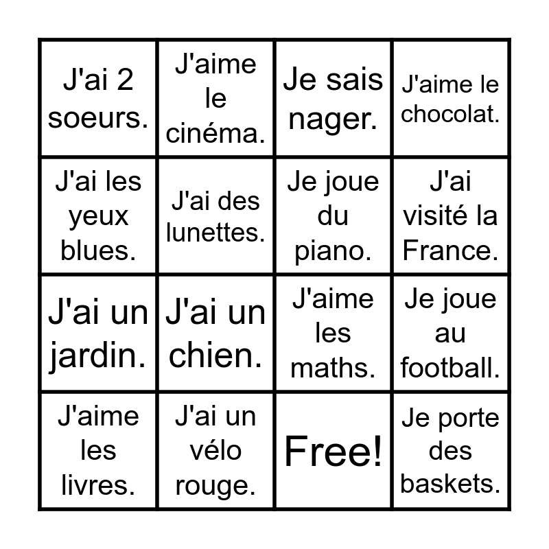 This bingo card has 17 words: Free!, J'aime les livres., Je sais nager., J'ai 2 soeurs., J'ai un chien., J'aime le chocolat., Je joue au football., Je joue du piano., J'ai visité la France., J'ai des lunettes., J'ai un vélo rouge., J'aime les maths., J'ai les yeux blues., J'aime le cinéma., J'ai un jardin., J'aime les fleurs. and Je porte des baskets..