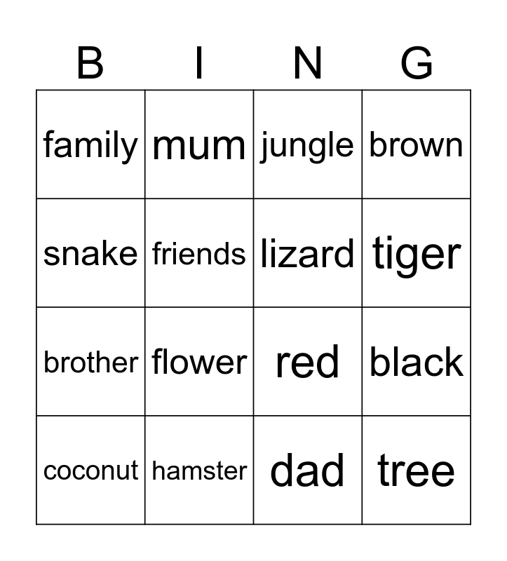 This bingo card has 26 words: scrapbook, elephant, tiger, bird, snake, family, friends, mum, dad, sister, brother, red, green, yellow, black, white, brown, tree, jungle, coconut, flower, bush, hamster, rabbit, lizard and parrot.
