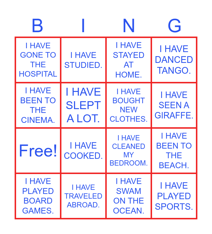 This bingo card has 20 words: I HAVE BEEN TO THE BEACH., I HAVE BEEN TO THE POOL., I HAVE STAYED AT HOME., I HAVE GONE TO MY FRIEND'S HOME., I HAVE PLAYED BOARD GAMES., I HAVE BEEN TO THE CINEMA., I HAVE TRAVELED ABROAD., I HAVE GONE TO THE HOSPITAL, Free!, I HAVE STUDIED., I HAVE COOKED., I HAVE CLEANED MY BEDROOM., I HAVE SLEPT A LOT., I HAVE PLAYED SPORTS., I HAVE BOUGHT NEW CLOTHES., I HAVE HIDDEN A BIKE., I HAVE SEEN A GIRAFFE., I HAVE DANCED TANGO., I HAVE SWAM ON THE OCEAN. and I HAVE STAYED UP ALL NIGHT..