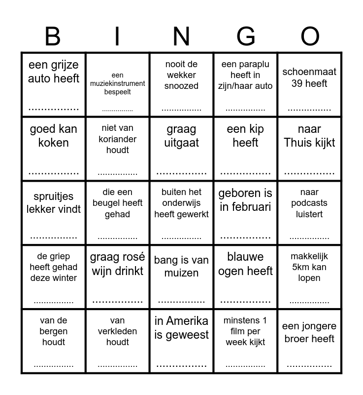 This bingo card has 25 words: graag rosé wijn drinkt ................, in Amerika is geweest ................, graag uitgaat ................, van de bergen houdt ................, schoenmaat 39 heeft ................, een grijze auto heeft ................, goed kan koken ................, een muziekinstrument bespeelt ................, geboren is in februari ................, bang is van muizen ................, een kip heeft ................, spruitjes lekker vindt ................, blauwe ogen heeft ................, makkelijk 5km kan lopen ................, niet van koriander houdt ................, een jongere broer heeft ................, naar podcasts luistert ................, nooit de wekker snoozed ................, naar Thuis kijkt ................, die een beugel heeft gehad ................, buiten het onderwijs heeft gewerkt ................, van verkleden houdt ................, de griep heeft gehad deze winter ................, een paraplu heeft in zijn/haar auto ................ and minstens 1 film per week kijkt .................