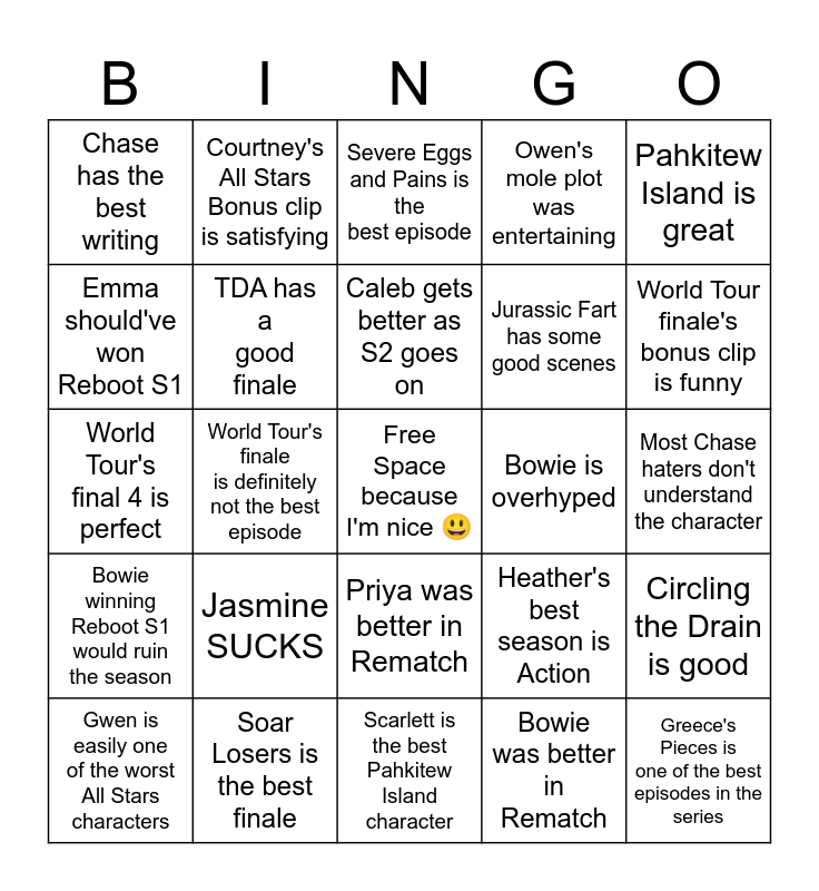 This bingo card has a free space and 24 words: Jasmine SUCKS, Soar Losers is the best finale, Caleb gets better as S2 goes on, Gwen is easily one of the worst All Stars characters, Pahkitew Island is great, Chase has the best writing, Emma should've won Reboot S1, Courtney's All Stars Bonus clip is satisfying, Bowie is overhyped, Priya was better in Rematch, Jurassic Fart has some good scenes, World Tour's final 4 is perfect, Heather's best season is Action, Circling the Drain is good, TDA has a good finale, Bowie was better in Rematch, Most Chase haters don't understand the character, Severe Eggs and Pains is the best episode, World Tour finale's bonus clip is funny, World Tour's finale is definitely not the best episode, Greece's Pieces is one of the best episodes in the series, Bowie winning Reboot S1 would ruin the season, Owen's mole plot was entertaining and Scarlett is the best Pahkitew Island character.