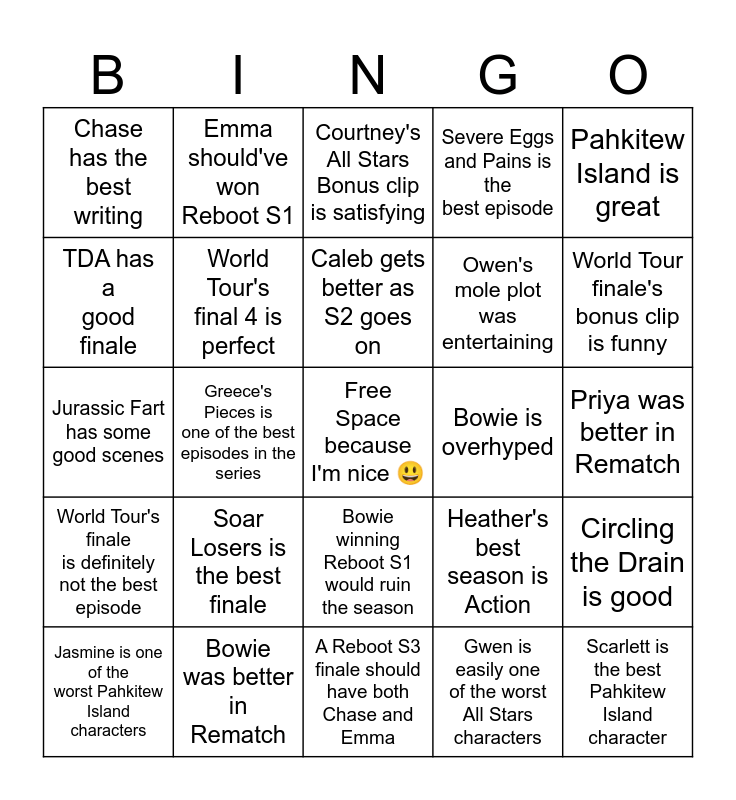 This bingo card has a free space and 24 words: Jasmine is one of the worst Pahkitew Island characters, Soar Losers is the best finale, Caleb gets better as S2 goes on, Gwen is easily one of the worst All Stars characters, Pahkitew Island is great, Chase has the best writing, Emma should've won Reboot S1, Courtney's All Stars Bonus clip is satisfying, Bowie is overhyped, Priya was better in Rematch, Jurassic Fart has some good scenes, World Tour's final 4 is perfect, Heather's best season is Action, Circling the Drain is good, TDA has a good finale, Bowie was better in Rematch, A Reboot S3 finale should have both Chase and Emma, Severe Eggs and Pains is the best episode, World Tour finale's bonus clip is funny, World Tour's finale is definitely not the best episode, Greece's Pieces is one of the best episodes in the series, Bowie winning Reboot S1 would ruin the season, Owen's mole plot was entertaining and Scarlett is the best Pahkitew Island character.