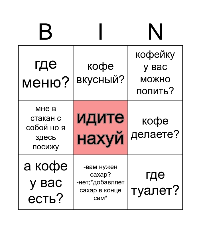 This bingo card has a free space and 8 words: кофе делаете?, кофейку у вас можно попить?, кофе вкусный?, а кофе у вас есть?, где меню?, где туалет?, мне в стакан с собой но я здесь посижу and -вам нужен сахар? -нет;*добавляет сахар в конце сам*.
