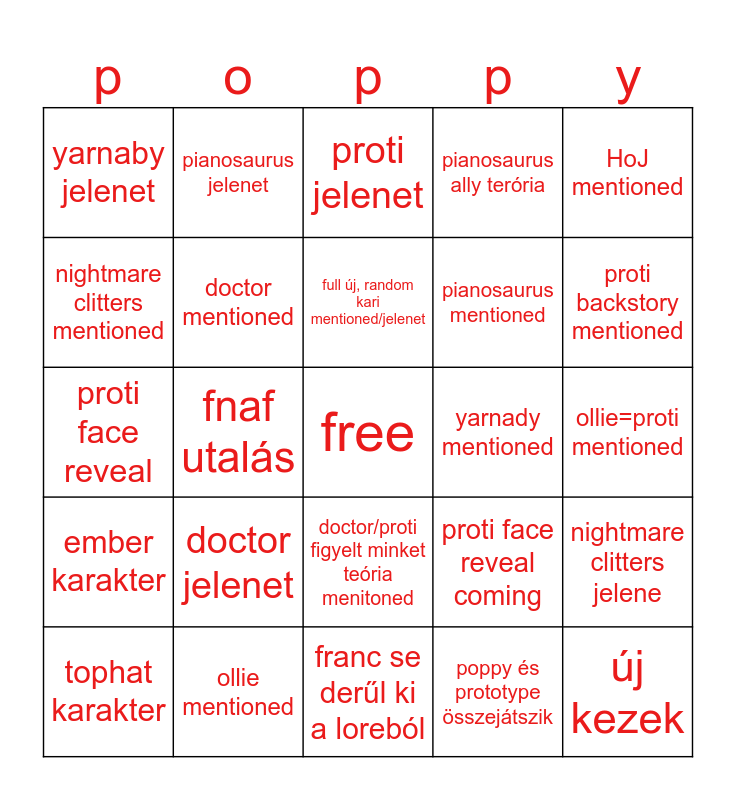 This bingo card has a free space and 29 words: tophat karakter, proti mentioned, fnaf utalás, film utalás, yarnaby jelenet, proti jelenet, doctor mentioned, doctor jelenet, yarnady mentioned, ollie mentioned, ollie=proti mentioned, új kezek, franc se derűl ki a loreból, poppy és prototype összejátszik, proti backstory mentioned, doctor backstory mentoined, doctor/proti figyelt minket teória menitoned, ember karakter, HoJ mentioned, proti face reveal, proti face reveal coming, yarnabi hazudott teória mentoined, pianosaurus mentioned, nightmare clitters mentioned, pianosaurus ally terória, pianosaurus jelenet, nightmare clitters jelene, full új, random kari mentioned/jelenet and főhős backstory mentioned.