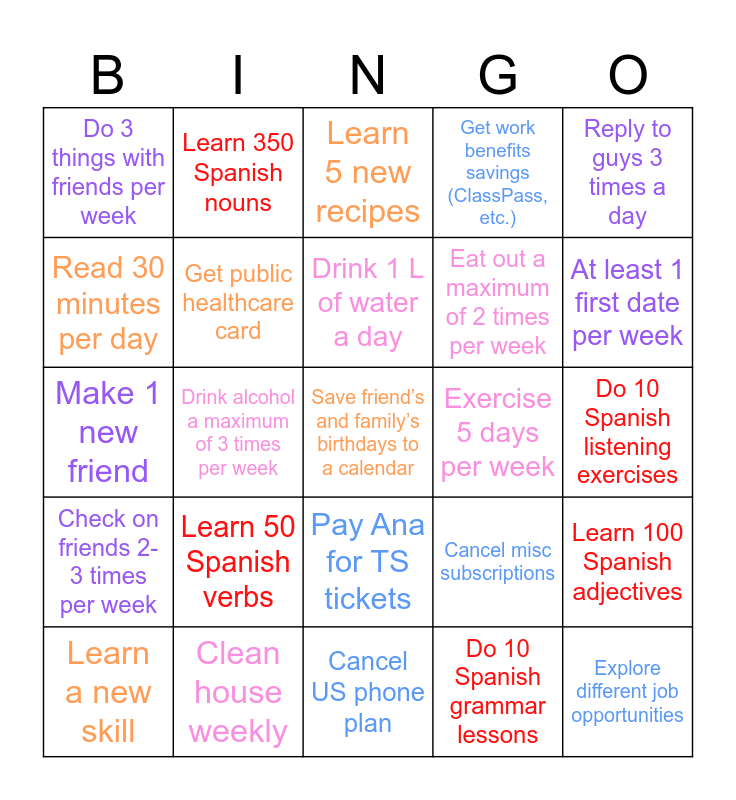 This bingo card has 25 words: Learn 50 Spanish verbs, Cancel US phone plan, Drink 1 L of water a day, Learn a new skill, Reply to guys 3 times a day, Do 3 things with friends per week, Read 30 minutes per day, Learn 350 Spanish nouns, Exercise 5 days per week, Pay Ana for TS tickets, Eat out a maximum of 2 times per week, Make 1 new friend, Cancel misc subscriptions, Learn 100 Spanish adjectives, Get public healthcare card, Explore different job opportunities, Do 10 Spanish listening exercises, Learn 5 new recipes, At least 1 first date per week, Drink alcohol a maximum of 3 times per week, Save friend’s and family’s birthdays to a calendar, Clean house weekly, Check on friends 2-3 times per week, Get work benefits savings (ClassPass, etc.) and Do 10 Spanish grammar lessons.