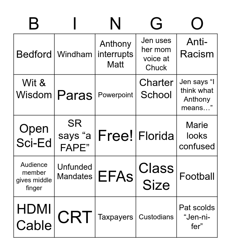 This bingo card has a free space and 24 words: Unfunded Mandates, CRT, Powerpoint, HDMI Cable, Anti-Racism, Bedford, Wit & Wisdom, Windham, Florida, EFAs, Charter School, Open Sci-Ed, Class Size, Football, Paras, Custodians, Marie looks confused, Anthony interrupts Matt, Jen says “I think what Anthony means…”, SR says “a FAPE”, Pat scolds “Jen-ni-fer”, Audience member gives middle finger, Jen uses her mom voice at Chuck and Taxpayers.