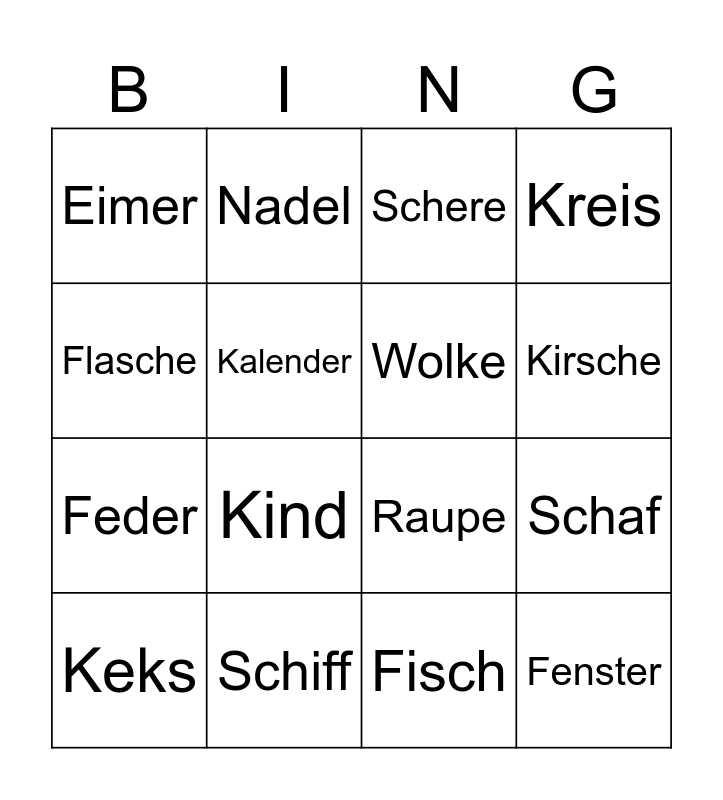 This bingo card has 16 words: Schiff, Schaf, Schere, Eimer, Feder, Nadel, Raupe, Fisch, Flasche, Kalender, Keks, Kreis, Kind, Kirsche, Wolke and Fenster.