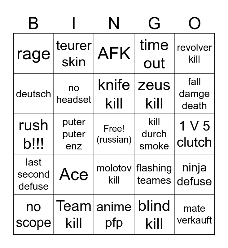 This bingo card has a free space and 24 words: Ace, Team kill, knife kill, no scope, revolver kill, rage, deutsch, teurer skin, kill durch smoke, molotov kill, zeus kill, rush b!!!, flashing teames, ninja defuse, no headset, blind kill, 1 V 5 clutch, AFK, fall damge death, puter puter enz, mate verkauft, last second defuse, time out and anime pfp.