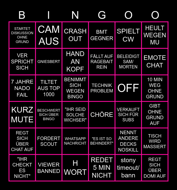 This bingo card has 36 words: "ES IST SO BEHINDERT", WHATSAPP NACHRICHT, REDET 5 MIN NICHT, VER SPRICHT SICH, KURZ MUTE, TECHNIK PROBLEM, GNIESBERT, H WORT, SPIELT CW, NENNT ANDERE DECKS NOSKILL, EMOTE CHAT, BMT GEGNER, TISCH WIRD MASSIERT, TILTET AUS TOP 1000, FÄLLT AUF RAGEBAIT REIN, STARTET DISKUSSION OHNE GRUND, REGT SICH ÜBER CHAT AUF, OFF, 7 JAHRE NADO FAIL, CRASH OUT, BENIMMT SICH WEGEN BINGO, BESCHWERT SICH ÜBER BINGO, CHÖRE, "IHR SEID SOLCHE WICHSER", VERKAUFT SICH FÜR SUBS, CAM AUS, BELEIDIGT SAM/ MORTEN, VIEWER BANNED, HAND AN KOPF, HEULT WEGEN MU, REGT SICH ÜBER DOMI AUF, "IHR CHECKT ES NICHT", GIBT OHNE GRUND AUF, 10 MIN WEG OHNE GRUND, FORDERT SCOUT and stony timeout/ bann.
