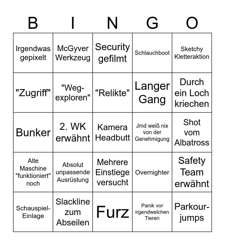 This bingo card has a free space and 24 words: Absolut unpassende Ausrüstung, Slackline zum Abseilen, "Relikte", Schauspiel-Einlage, Sketchy Kletteraktion, Irgendwas gepixelt, "Zugriff", McGyver Werkzeug, Jmd weiß nix von der Genehmigung, Mehrere Einstiege versucht, Langer Gang, Bunker, Overnighter, Safety Team erwähnt, "Weg-exploren", Panik vor irgendwelchen Tieren, Shot vom Albatross, Security gefilmt, Durch ein Loch kriechen, 2. WK erwähnt, Parkour-jumps, Alte Maschine "funktioniert" noch, Schlauchboot and Furz.
