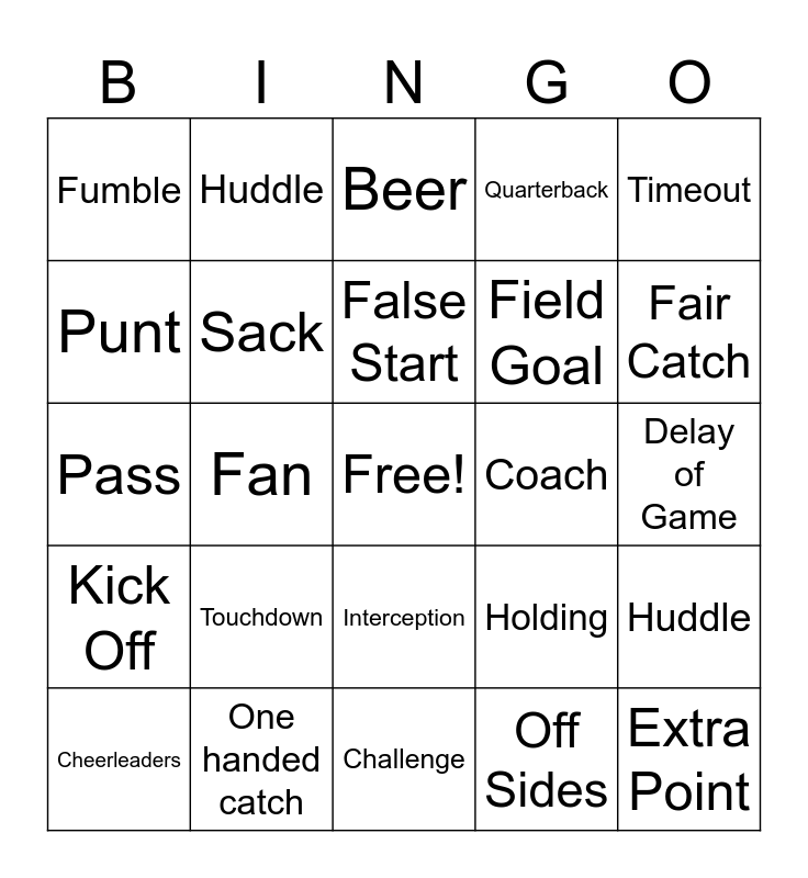 This bingo card has a free space and 25 words: Touchdown, Challenge, False Start, Cheerleaders, Timeout, Fumble, Punt, Huddle, Coach, Interception, Field Goal, Pass, Holding, Huddle, Sack, Offsides, Delay of Game, Beer, Fair Catch, Fan, Extra Point, One handed catch, Kick Off, Quarterback and Off Sides.