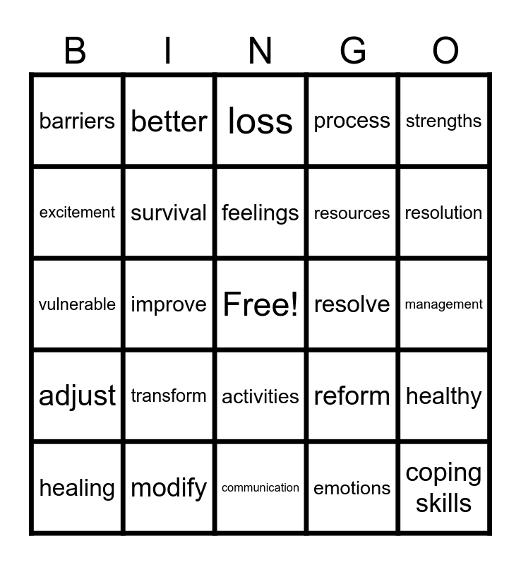 This bingo card has a free space and 29 words: healing, recovery, improve, change, barriers, loss, survival, transform, resolve, modify, management, coping skills, communication, emotions, resolution, worries, activities, adjust, strengths, vulnerable, reform, You can do it!!, resources, excitement, process, better, healthy, feelings and Way to Go!!.