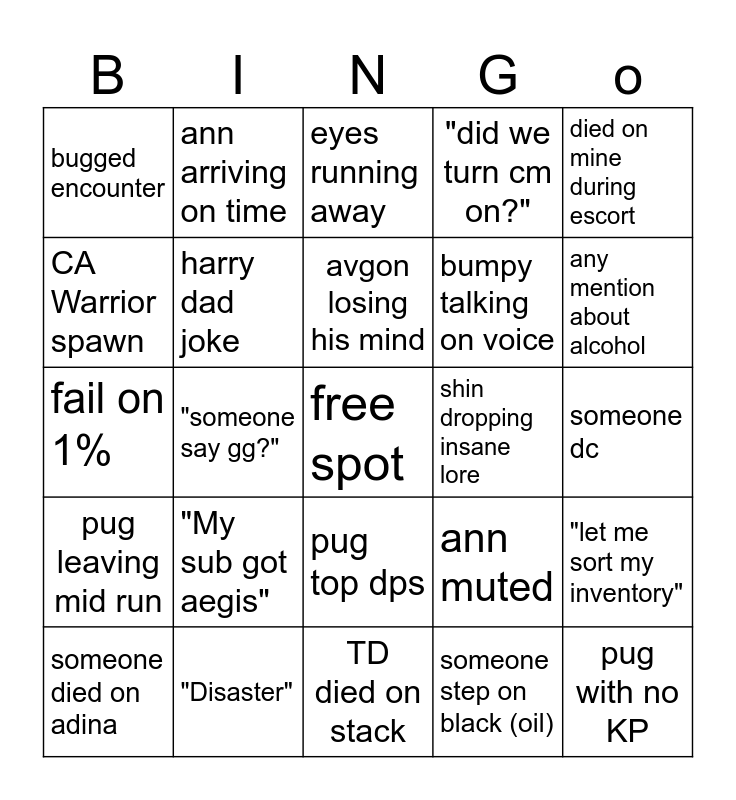 This bingo card has a free space and 24 words: "My sub got aegis", "Disaster", avgon losing his mind, someone died on adina, died on mine during escort, bugged encounter, CA Warrior spawn, ann arriving on time, shin dropping insane lore, pug top dps, bumpy talking on voice, fail on 1%, ann muted, "let me sort my inventory", harry dad joke, someone step on black (oil), someone dc, eyes running away, any mention about alcohol, "someone say gg?", pug with no KP, pug leaving mid run, "did we turn cm on?" and TD died on stack.