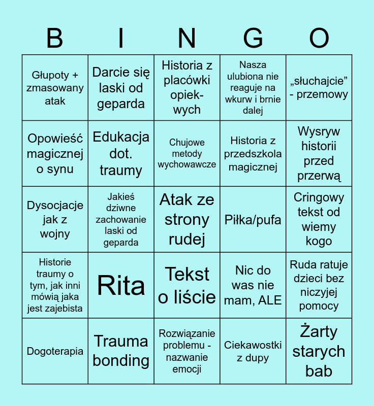 This bingo card has a free space and 24 words: Rita, Trauma bonding, Chujowe metody wychowawcze, Dogoterapia, „słuchajcie” - przemowy, Głupoty + zmasowany atak, Opowieść magicznej o synu, Darcie się laski od geparda, Piłka/pufa, Tekst o liście, Historia z przedszkola magicznej, Dysocjacje jak z wojny, Nic do was nie mam, ALE, Ruda ratuje dzieci bez niczyjej pomocy, Edukacja dot. traumy, Ciekawostki z dupy, Cringowy tekst od wiemy kogo, Historia z placówki opiek-wych, Wysryw historii przed przerwą, Jakieś dziwne zachowanie laski od geparda, Żarty starych bab, Historie traumy o tym, jak inni mówią jaka jest zajebista, Nasza ulubiona nie reaguje na wkurw i brnie dalej and Rozwiązanie problemu - nazwanie emocji.
