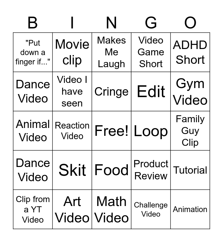 This bingo card has a free space and 24 words: Skit, Art Video, Cringe, Clip from a YT Video, ADHD Short, "Put down a finger if...", Dance Video, Movie clip, Loop, Food, Edit, Animal Video, Product Review, Tutorial, Video I have seen, Challenge Video, Family Guy Clip, Makes Me Laugh, Gym Video, Reaction Video, Animation, Dance Video, Video Game Short and Math Video.