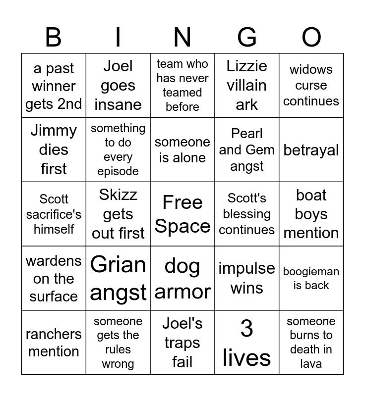 This bingo card has a free space and 24 words: Grian angst, someone gets the rules wrong, someone is alone, ranchers mention, widows curse continues, a past winner gets 2nd, Jimmy dies first, Joel goes insane, Scott's blessing continues, dog armor, Pearl and Gem angst, Scott sacrifice's himself, impulse wins, boogieman is back, something to do every episode, 3 lives, boat boys mention, team who has never teamed before, betrayal, Skizz gets out first, someone burns to death in lava, wardens on the surface, Lizzie villain ark and Joel's traps fail.