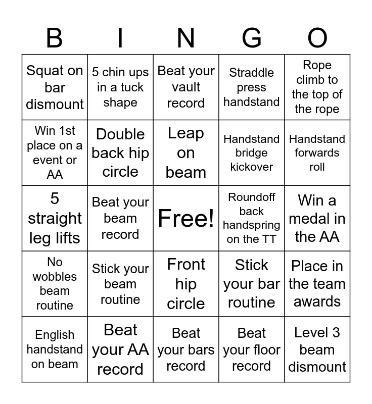 This bingo card has a free space and 24 words: Stick your beam routine, Beat your AA record, Leap on beam, English handstand on beam, Rope climb to the top of the rope, Squat on bar dismount, Win 1st place on a event or AA, 5 chin ups in a tuck shape, Roundoff back handspring on the TT, Front hip circle, Handstand bridge kickover, 5 straight leg lifts, Stick your bar routine, Place in the team awards, Double back hip circle, Beat your floor record, Win a medal in the AA, Beat your vault record, Handstand forwards roll, Beat your beam record, Level 3 beam dismount, No wobbles beam routine, Straddle press handstand and Beat your bars record.