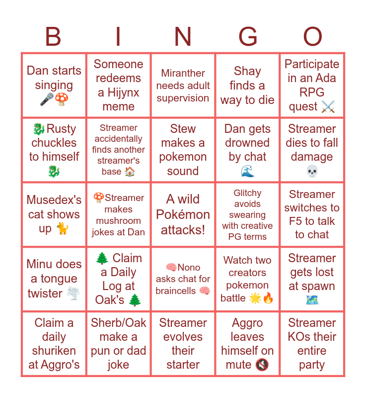 This bingo card has a free space and 24 words: π² Claim a Daily Log at Oak's π², Sherb/Oak make a pun or dad joke, Stew makes a pokemon sound, Claim a daily shuriken at Aggro's, Participate in an Ada RPG quest βοΈ, Dan starts singing π€π, πRusty chuckles to himself π, Someone redeems a Hijynx meme, Glitchy avoids swearing with creative PG terms, π§ Nono asks chat for braincells π§ , Dan gets drowned by chat π, Musedex's cat shows up π, Watch two creators pokemon battle ππ₯, Streamer gets lost at spawn πΊοΈ, Streamer accidentally finds another streamer's base π , Aggro leaves himself on mute π, Streamer switches to F5 to talk to chat, Miranther needs adult supervision, Streamer dies to fall damage π, πStreamer makes mushroom jokes at Dan, Streamer KOs their entire party, Minu does a tongue twister πͺοΈ, Shay finds a way to die and Streamer evolves their starter.