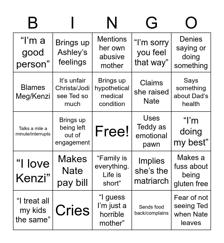 This bingo card has a free space and 24 words: Makes Nate pay bill, Cries, Brings up hypothetical medical condition, “I treat all my kids the same”, Denies saying or doing something, “I’m a good person”, Blames Meg/Kenzi, Brings up Ashley’s feelings, Uses Teddy as emotional pawn, “Family is everything. Life is short”, Claims she raised Nate, Talks a mile a minute/interrupts, Implies she’s the matriarch, Makes a fuss about being gluten free, It’s unfair Christa/Jodi see Ted so much, Sends food back/complains, “I’m doing my best”, Mentions her own abusive mother, Says something about Dad’s health, Brings up being left out of engagement, Fear of not seeing Ted when Nate leaves, “I love Kenzi”, “I’m sorry you feel that way” and “I guess I’m just a horrible mother”.