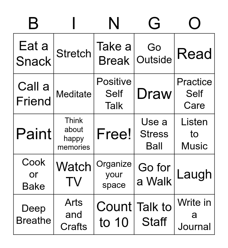 This bingo card has a free space and 24 words: Watch TV, Arts and Crafts, Positive Self Talk, Deep Breathe, Read, Eat a Snack, Call a Friend, Stretch, Use a Stress Ball, Organize your space, Draw, Paint, Go for a Walk, Laugh, Meditate, Talk to Staff, Listen to Music, Take a Break, Practice Self Care, Think about happy memories, Write in a Journal, Cook or Bake, Go Outside and Count to 10.