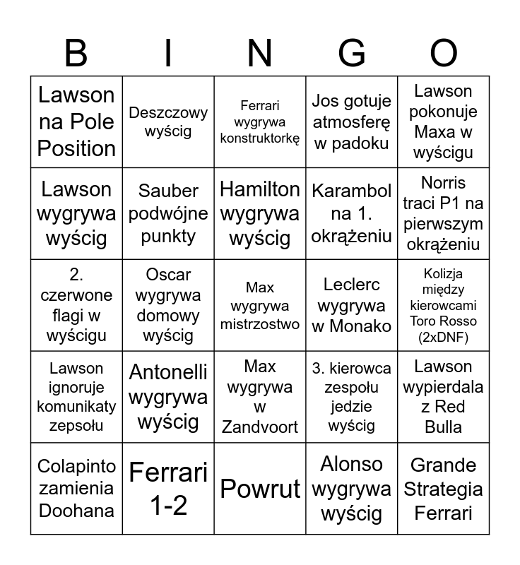 This bingo card has a free space and 24 words: Antonelli wygrywa wyścig, Ferrari 1-2, Hamilton wygrywa wyścig, Colapinto zamienia Doohana, Lawson pokonuje Maxa w wyścigu, Lawson na Pole Position, Lawson wygrywa wyścig, Deszczowy wyścig, Leclerc wygrywa w Monako, Max wygrywa w Zandvoort, Karambol na 1. okrążeniu, 2. czerwone flagi w wyścigu, 3. kierowca zespołu jedzie wyścig, Lawson wypierdala z Red Bulla, Sauber podwójne punkty, Alonso wygrywa wyścig, Kolizja między kierowcami Toro Rosso (2xDNF), Ferrari wygrywa konstruktorkę, Norris traci P1 na pierwszym okrążeniu, Oscar wygrywa domowy wyścig, Grande Strategia Ferrari, Lawson ignoruje komunikaty zepsołu, Jos gotuje atmosferę w padoku and Powrut.
