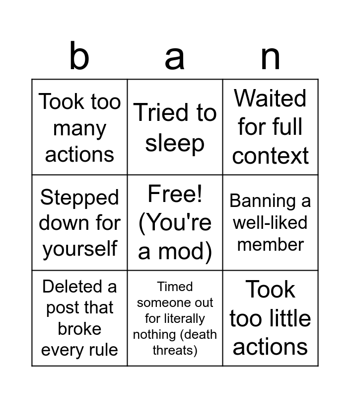 This bingo card has a free space and 8 words: Banning a well-liked member, Waited for full context, Tried to sleep, Deleted a post that broke every rule, Took too many actions, Took too little actions, Stepped down for yourself and Timed someone out for literally nothing (death threats).