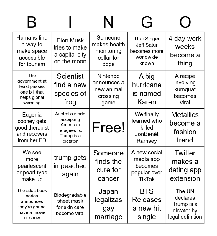 This bingo card has a free space and 25 words: trump gets impeached again, Japan legalizas gay marriage, Nintendo announces a new animal crossing game, The atlas book series announces they’re gonna have a movie or show, 4 day work weeks become a thing, Humans find a way to make space accessible for tourism, The government at least passes one bill that helps global warming, Elon Musk tries to make a capital city on the moon, We finally learned who killed JonBenét Ramsey, Someone finds the cure for cancer, A big hurricane is named Karen, Eugenia cooney gets good therapist and recovers from her ED, A new social media app becomes popular over TikTok, Twitter makes a dating app extension, Scientist find a new species of frog, An AI song wins a Grammy award, Metallics become a fashion trend, Someone makes health monitoring collar for dogs, A recipe involving kumquat becomes viral, Australia starts accepting American refugees bc Trump is a dictator, The UN declares Trump is a dictator by legal definition, Biodegradable sheet mask for skin care become viral, We see more pearlescent or pearl type make up, Thai Singer Jeff Satur becomes more worldwide known and BTS Releases a new hit single.