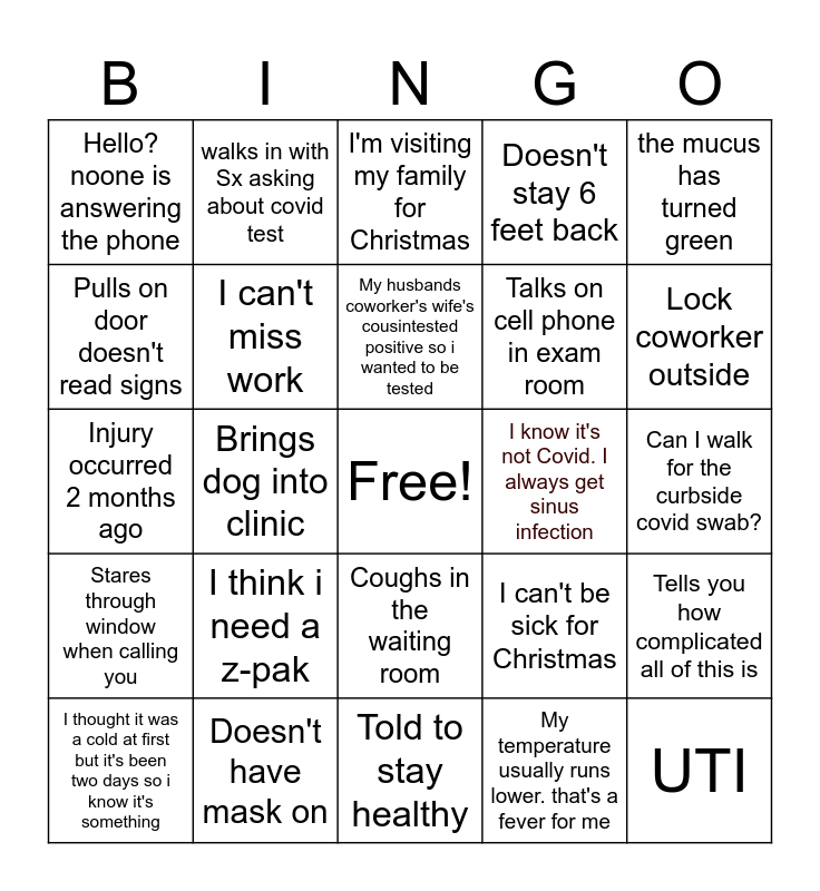 This bingo card has a free space and 24 words: I thought it was a cold at first but it's been two days so i know it's something, I think i need a z-pak, My husbands coworker's wife's cousintested positive so i wanted to be tested, My temperature usually runs lower. that's a fever for me, the mucus has turned green, Hello? noone is answering the phone, walks in with Sx asking about covid test, I'm visiting my family for Christmas, I know it's not Covid. I always get sinus infection, Can I walk for the curbside covid swab?, Injury occurred 2 months ago, I can't miss work, I can't be sick for Christmas, Tells you how complicated all of this is, Pulls on door doesn't read signs, Doesn't have mask on, Told to stay healthy, Doesn't stay 6 feet back, Lock coworker outside, Stares through window when calling you, Brings dog into clinic, Coughs in the waiting room, Talks on cell phone in exam room and UTI.