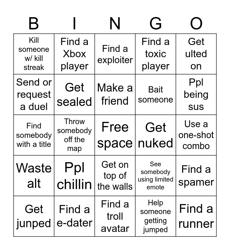 This bingo card has a free space and 24 words: Get junped, Ppl chillin, Make a friend, Help someone getting jumped, Get ulted on, Kill someone w/ kill streak, Find a Xbox player, Find a exploiter, Get nuked, Use a one-shot combo, Find somebody with a title, Get sealed, See somebody using limited emote, Find a spamer, Send or request a duel, Find a e-dater, Find a troll avatar, Find a toxic player, Ppl being sus, Waste alt, Throw somebody off the map, Get on top of the walls, Bait someone and Find a runner.