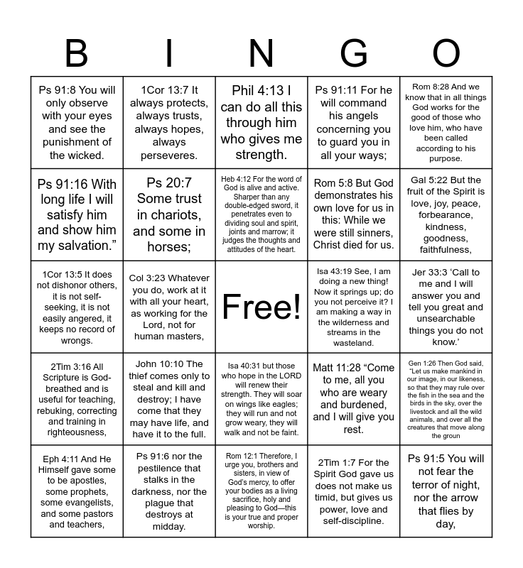This bingo card has a free space and 106 words: John 3:16 For God so loved the world that he gave his one and only Son, that whoever believes in him shall not perish but have eternal life., Jer 29:11 For I know the plans I have for you,” declares the LORD, “plans to prosper you and not to harm you, plans to give you hope and a future., Rom 8:28 And we know that in all things God works for the good of those who love him, who have been called according to his purpose., Ps 23:4 Even though I walk through the darkest valley, I will fear no evil, for you are with me; your rod and your staff, they comfort me., Ps 23:6 Surely your goodness and love will follow me all the days of my life, and I will dwell in the house of the LORD forever., Ps 23:5 You prepare a table before me in the presence of my enemies. You anoint my head with oil; my cup overflows., Matt 6:33 But seek first his kingdom and his righteousness, and all these things will be given to you as well., Ps 23:3 he refreshes my soul. He guides me along the right paths for his name’s sake., Ps 23:1 The LORD is my shepherd, I lack nothing., Phil 4:6 Do not be anxious about anything, but in every situation, by prayer and petition, with thanksgiving, present your requests to God., Rom 12:2 Do not conform to the pattern of this world, but be transformed by the renewing of your mind. Then you will be able to test and approve what God’s will is—his good, pleasing and perfect will., Ps 23:2 He makes me lie down in green pastures, he leads me beside quiet waters,, Phil 4:7 And the peace of God, which transcends all understanding, will guard your hearts and your minds in Christ Jesus., Eph 6:12 For our struggle is not against flesh and blood, but against the rulers, against the authorities, against the powers of this dark world and against the spiritual forces of evil in the heavenly realms., Isa 41:10 So do not fear, for I am with you; do not be dismayed, for I am your God. I will strengthen you and help you; I will uphold you with my righteous right hand., Phil 4:8 Finally, brothers and sisters, whatever is true, whatever is noble, whatever is right, whatever is pure, whatever is lovely, whatever is admirable—if anything is excellent or praiseworthy—think about such things., Phil 4:13 I can do all this through him who gives me strength., Josh 1:9 Have I not commanded you? Be strong and courageous. Do not be afraid; do not be discouraged, for the LORD your God will be with you wherever you go.”, John 16:33 “I have told you these things, so that in me you may have peace. In this world you will have trouble. But take heart! I have overcome the world.”, John 14:6 Jesus answered, “I am the way and the truth and the life. No one comes to the Father except through me., Isa 40:31 but those who hope in the LORD will renew their strength. They will soar on wings like eagles; they will run and not grow weary, they will walk and not be faint., 2Cor 5:17 Therefore, if anyone is in Christ, the new creation has come: The old has gone, the new is here!, Prov 3:5 Trust in the LORD with all your heart and lean not on your own understanding;, Prov 3:6 in all your ways submit to him, and he will make your paths straight., 1Pet 5:7 Cast all your anxiety on him because he cares for you., John 10:10 The thief comes only to steal and kill and destroy; I have come that they may have life, and have it to the full., Gal 5:22 But the fruit of the Spirit is love, joy, peace, forbearance, kindness, goodness, faithfulness,, Ps 91:11 For he will command his angels concerning you to guard you in all your ways;, Matt 28:20 and teaching them to obey everything I have commanded you. And surely I am with you always, to the very end of the age.”, Matt 28:19 Therefore go and make disciples of all nations, baptizing them in the name of the Father and of the Son and of the Holy Spirit,, Matt 11:28 “Come to me, all you who are weary and burdened, and I will give you rest., 2Tim 1:7 For the Spirit God gave us does not make us timid, but gives us power, love and self-discipline., Ps 91:1 Whoever dwells in the shelter of the Most High will rest in the shadow of the Almighty., Eph 2:10 For we are God’s handiwork, created in Christ Jesus to do good works, which God prepared in advance for us to do., Ps 91:4 He will cover you with his feathers, and under his wings you will find refuge; his faithfulness will be your shield and rampart., Gal 5:23 gentleness and self-control. Against such things there is no law., Ps 91:2 I will say of the LORD, “He is my refuge and my fortress, my God, in whom I trust.”, John 14:27 Peace I leave with you; my peace I give you. I do not give to you as the world gives. Do not let your hearts be troubled and do not be afraid., Heb 4:12 For the word of God is alive and active. Sharper than any double-edged sword, it penetrates even to dividing soul and spirit, joints and marrow; it judges the thoughts and attitudes of the heart., Ps 91:12 they will lift you up in their hands, so that you will not strike your foot against a stone., Ps 91:7 A thousand may fall at your side, ten thousand at your right hand, but it will not come near you., Ps 91:10 no harm will overtake you, no disaster will come near your tent., Ps 91:15 He will call on me, and I will answer him; I will be with him in trouble, I will deliver him and honor him., 2Tim 3:16 All Scripture is God-breathed and is useful for teaching, rebuking, correcting and training in righteousness,, Ps 91:9 If you say, “The LORD is my refuge,” and you make the Most High your dwelling,, Ps 91:16 With long life I will satisfy him and show him my salvation.”, Ps 91:14 “Because he loves me,” says the LORD, “I will rescue him; I will protect him, for he acknowledges my name., Ps 91:8 You will only observe with your eyes and see the punishment of the wicked., 1John 1:9 If we confess our sins, he is faithful and just and will forgive us our sins and purify us from all unrighteousness.