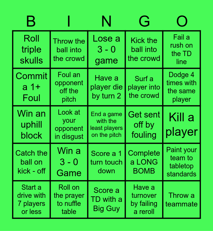 This bingo card has 25 words: Win a 3 - 0 Game, Score a TD with a Big Guy, Have a player die by turn 2, Start a drive with 7 players or less, Fail a rush on the TD line, Roll triple skulls, Commit a 1+ Foul, Throw the ball into the crowd, Get sent off by fouling, Score a 1 turn touch down, Surf a player into the crowd, Win an uphill block, Complete a LONG BOMB, Paint your team to tabletop standards, Foul an opponent off the pitch, Throw a teammate, Kill a player, Lose a 3 - 0 game, Dodge 4 times with the same player, Look at your opponent in disgust, End a game with the least players on the pitch, Roll on the prayer to nuffle table, Catch the ball on kick - off, Kick the ball into the crowd and Have a turnover by failing a reroll.