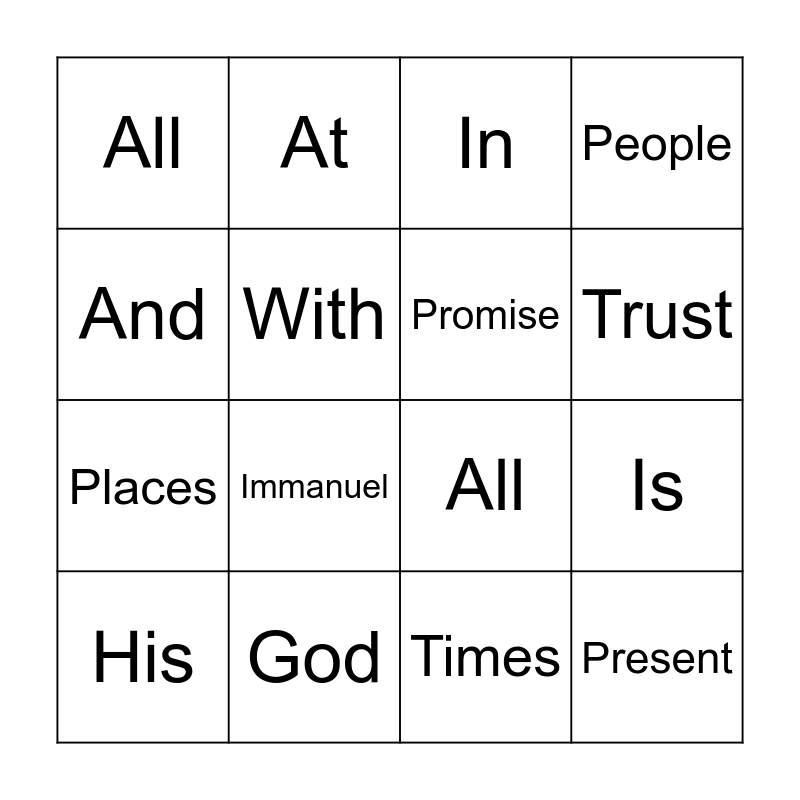 This bingo card has 16 words: God, Is, In, All, Places, At, All, Times, And, With, His, People, Immanuel, Trust, Promise and Present.