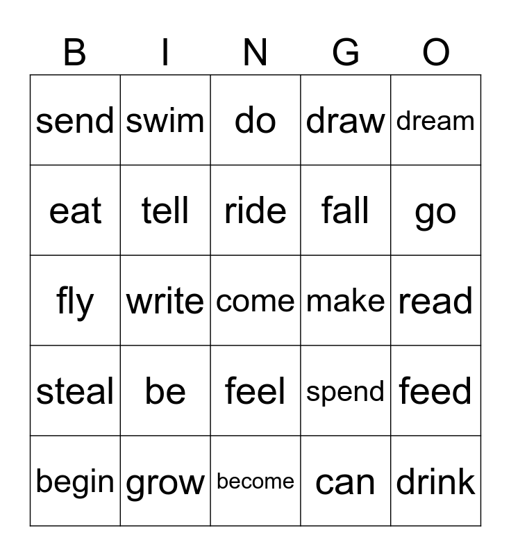 This bingo card has a free space and 24 words: be, grow, ride, begin, dream, send, eat, swim, make, feel, fall, fly, spend, feed, tell, can, read, do, go, write, drink, steal, draw and become.