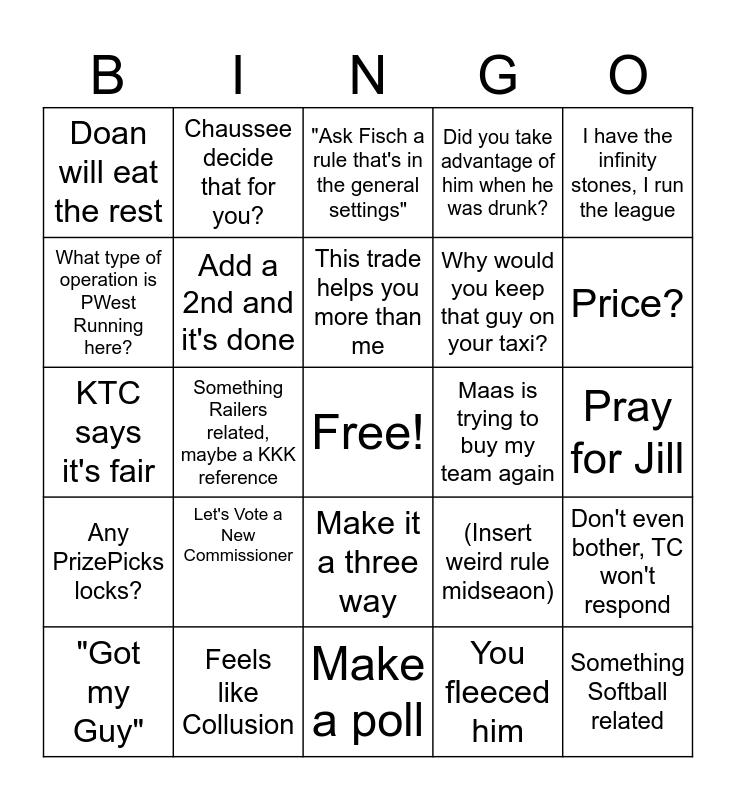 This bingo card has a free space and 24 words: Let's Vote a New Commissioner, Feels like Collusion, This trade helps you more than me, "Got my Guy", I have the infinity stones, I run the league, Doan will eat the rest, What type of operation is PWest Running here?, Chaussee decide that for you?, Maas is trying to buy my team again, Make it a three way, Why would you keep that guy on your taxi?, KTC says it's fair, (Insert weird rule midseaon), Don't even bother, TC won't respond, Add a 2nd and it's done, You fleeced him, Pray for Jill, "Ask Fisch a rule that's in the general settings", Price?, Something Railers related, maybe a KKK reference, Something Softball related, Any PrizePicks locks?, Did you take advantage of him when he was drunk? and Make a poll.