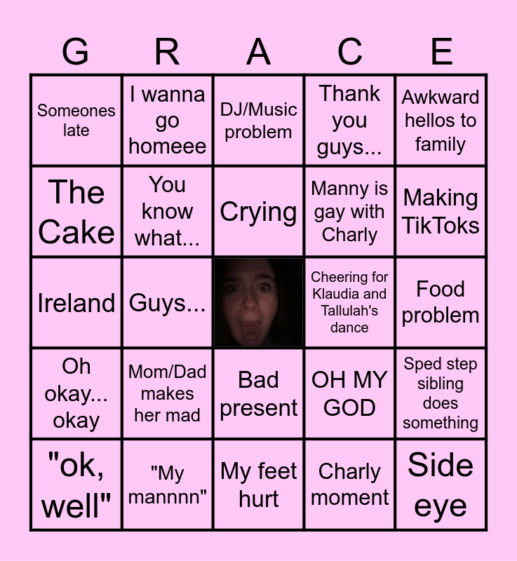 This bingo card has a free space and 24 words: Mom/Dad makes her mad, "My mannnn", Crying, "ok, well", Awkward hellos to family, Someones late, The Cake, I wanna go homeee, Cheering for Klaudia and Tallulah's dance, Bad present, Manny is gay with Charly, Ireland, OH MY GOD, Sped step sibling does something, You know what..., Charly moment, Food problem, DJ/Music problem, Making TikToks, Guys..., Side eye, Oh okay... okay, Thank you guys... and My feet hurt.